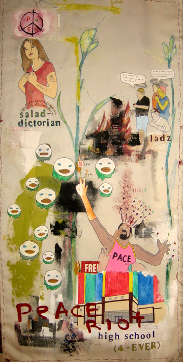 acrylic, ink, sewn collage on unstretched silk blend canvas | ~40" x 20"
